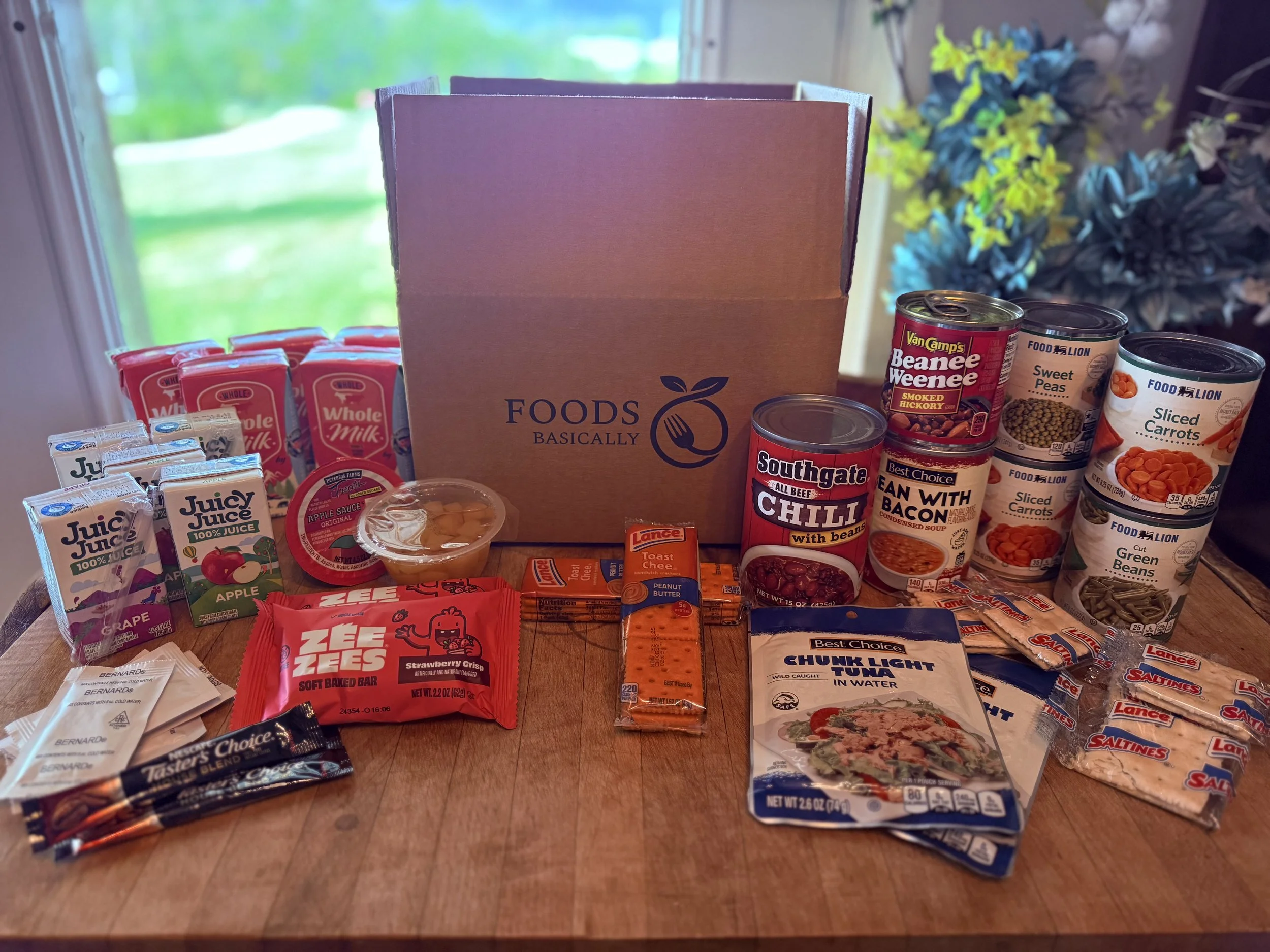Tuna pouch, Peanut butter crackers, Fruit bar, Apple juice, Liquid Shelf stable Milk, Iced Tea packet, Saltines